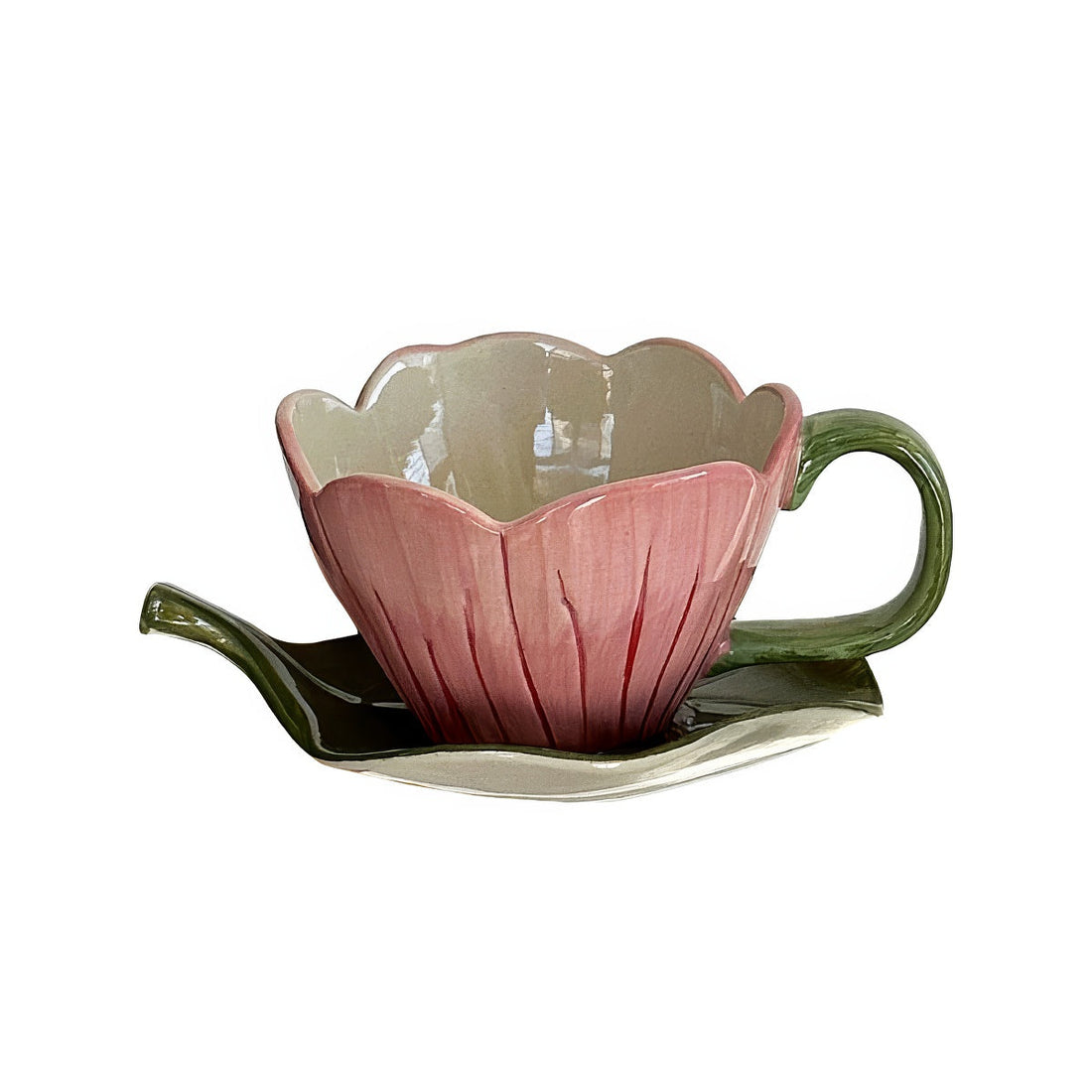 Zestaw ceramicznych filiżanek z kwiatkiem i spodkiem w kształcie liścia