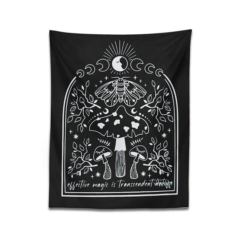 Czarno-biała, magiczna tapiseria z motywem kota i księżyca w stylu tarotowym. Idealna do powieszenia na...