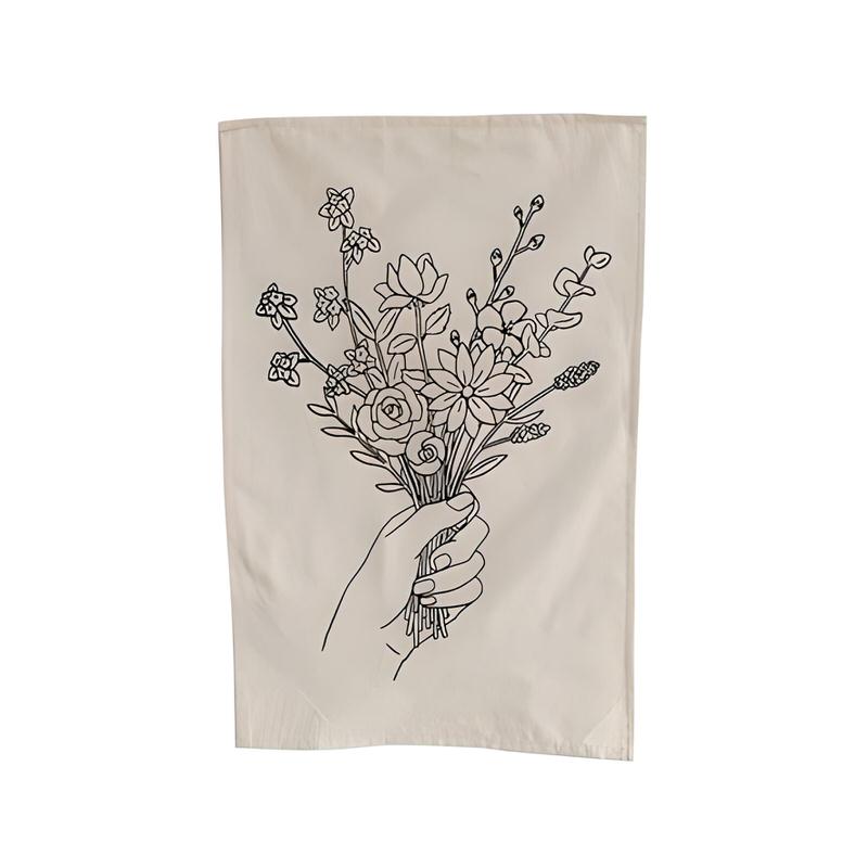 Prosty, konturowy nadruk dłoni trzymającej polne kwiaty na grubej i twardej tkaninie o jasnobeżowym kolorze....