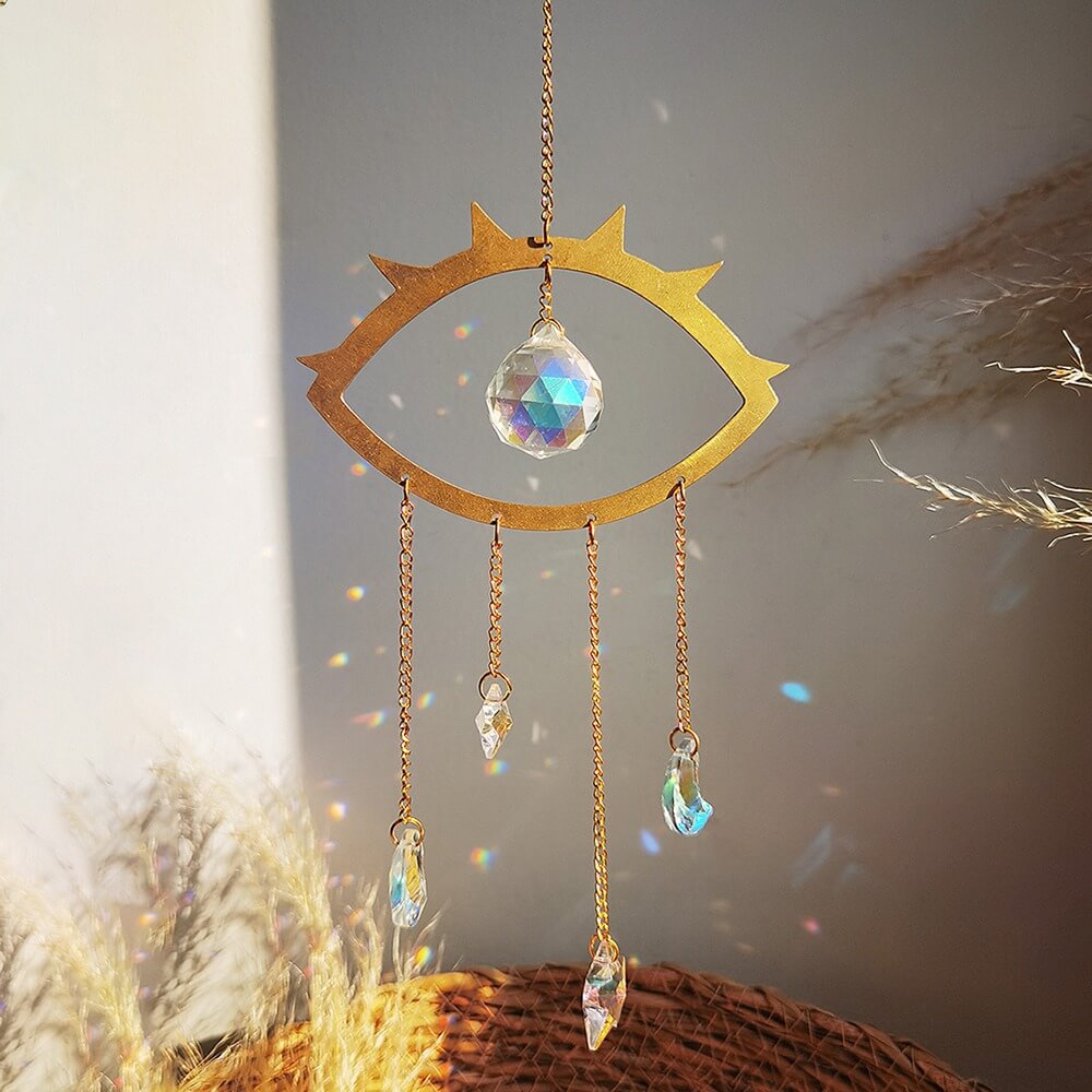 Łapacz słońca w kształcie oka z metalową złotą ramą, ozdobiony kryształowymi zawieszkami ze szkła. Zawieś...