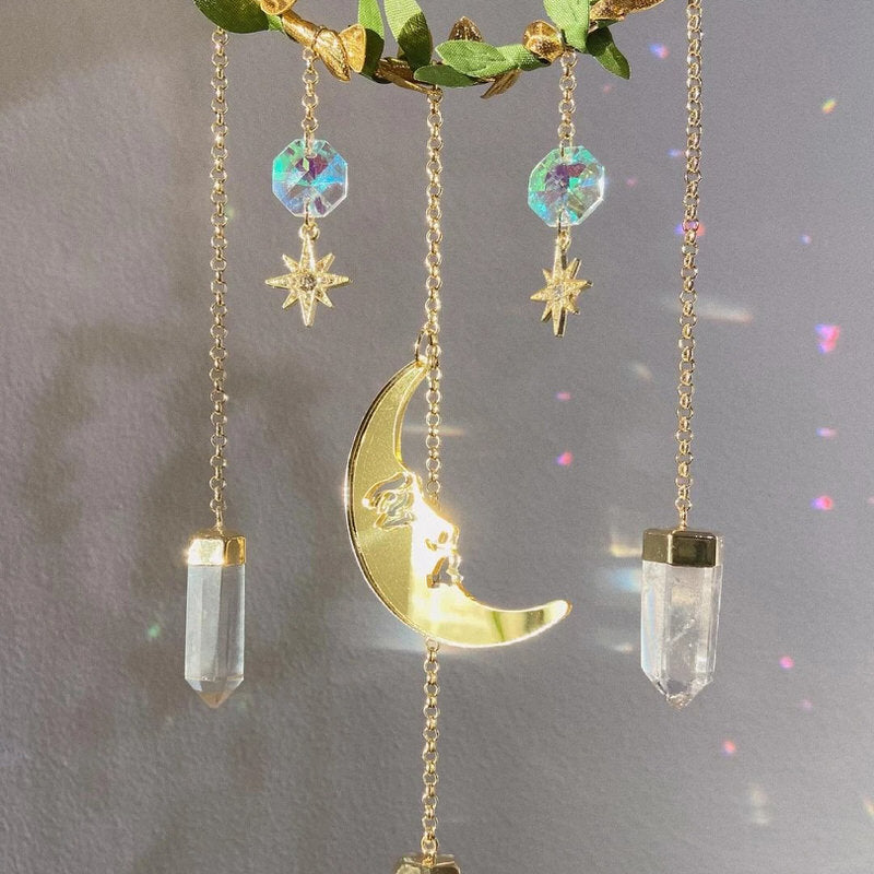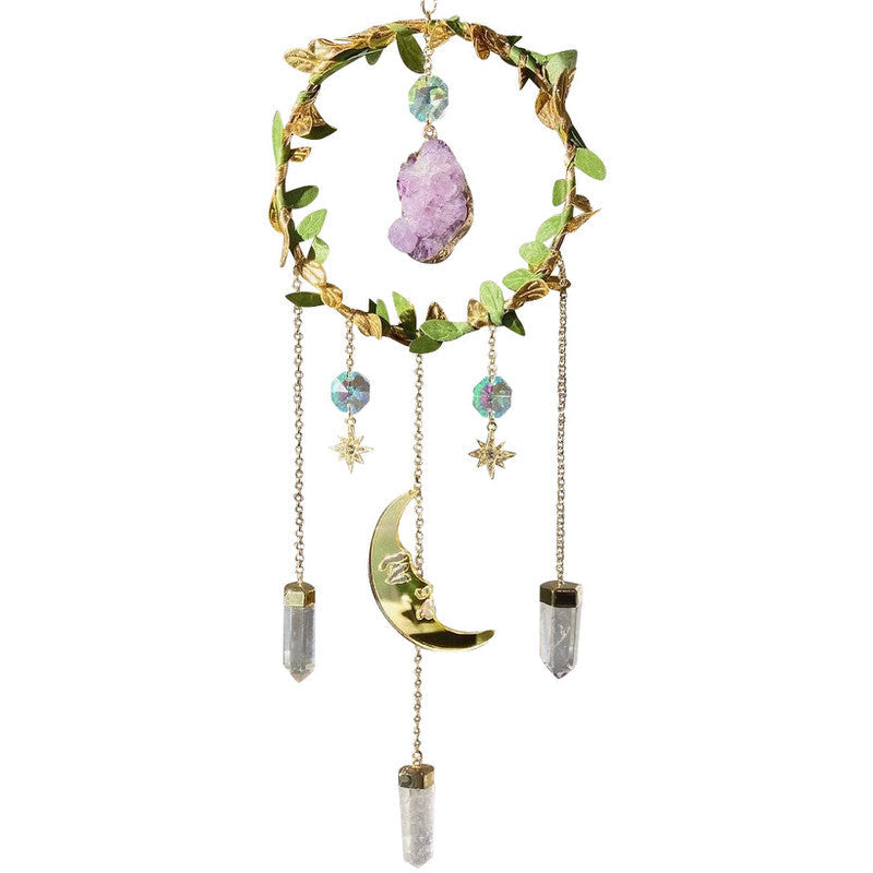 Estetyczny łapacz słońca w okrągłej ramce, ozdobiony sztucznymi liśćmi, kryształem górskim oraz ametystem, z uroczą zawieszką w kształcie księżyca. Powieś tę piękność w dobrze nasłonecznionym miejscu w pobliżu okna i ciesz się swoim pokojem wypełnionym magicznymi świetlnymi refleksami!