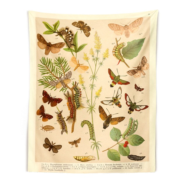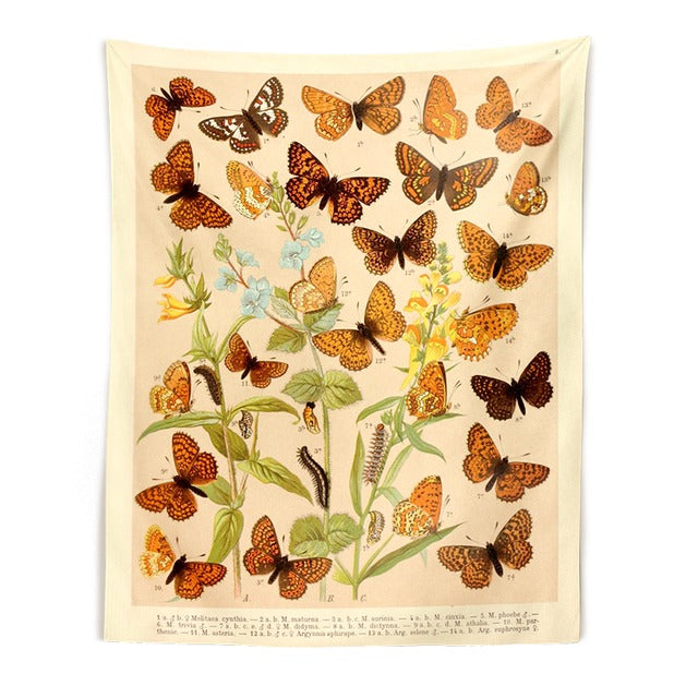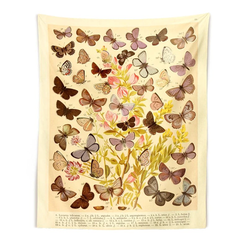 Francuska botaniczna edukacyjna tapiseria ścienna w estetyce cottagecore z nadrukiem różnych gatunków motyli. Idealna do powieszenia na suficie nad łóżkiem. Tapiserie ścienne potrafią odmienić styl Twojego pokoju w zaledwie minutę! Lekka, łatwa do zawieszenia na ścianie lub suficie, a także wytrzymała, dzięki czemu możesz używać jej jako koca na zewnątrz lub obrusa.
