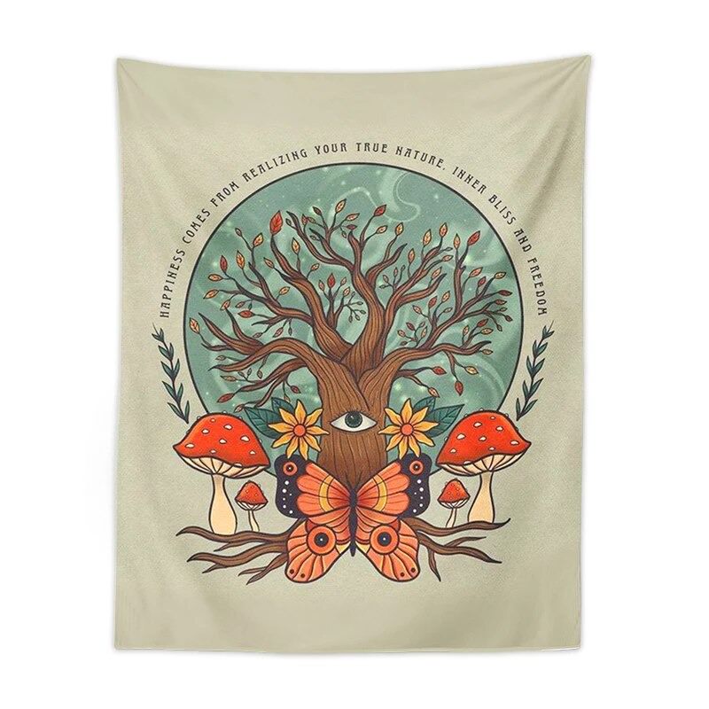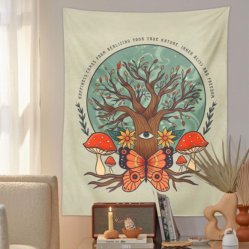 Gobelin na ścianę w stylu fairycore z nadrukiem drzewa, motyla i grzybów. Gobeliny ścienne potrafią odmienić wygląd twojego pokoju w zaledwie minutę! Lekki do zawieszenia na ścianie lub suficie, a jednocześnie wytrzymały do użycia jako koc na zewnątrz lub obrus.