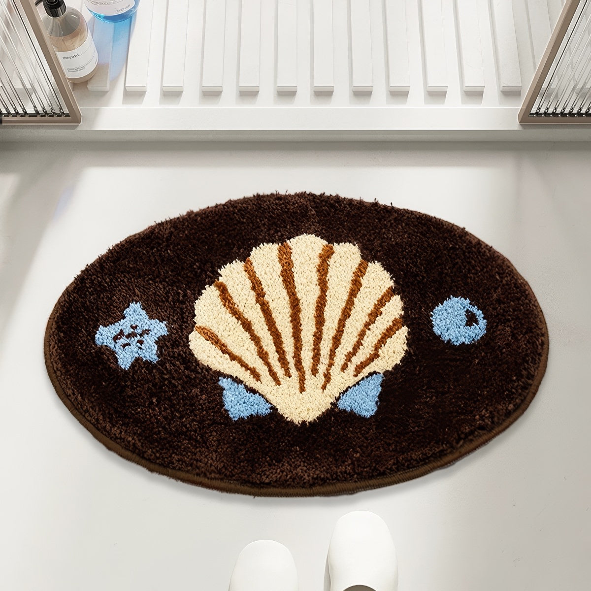 Zanurz się w przytulnym, nadmorskim klimacie z dywanikiem Coconut Girl Seashell Accent Rug. Dywanik o miękkim, owalnym kształcie w głębokim, kakaowym brązie zdobi centralnie kremowa muszla z jasnoniebieskimi akcentami oraz uroczymi, wodnymi detalami, takimi jak rozgwiazda i bąbelki. Miękki pod stopami i szybko chłonący wilgoć, świetnie sprawdzi się przy wejściu do łazienki lub w kącie sypialni, gdzie zapragniesz dodać odrobiny morskiego stylu. Niezależnie od tego, czy wychodzisz spod prysznica, czy po prostu chcesz rozjaśnić swoje wnętrze, ten dywanik wprowadza do pomieszczenia lekkość i nadmorski urok.