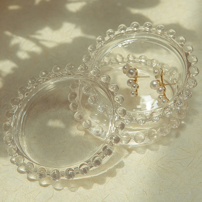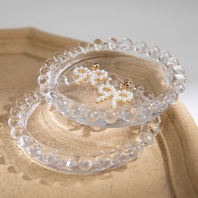 Ta urocza, przezroczysta szklana tacka na biżuterię w stylu coquette może służyć jako mini taca do przechowywania, organizer na biżuterię lub po prostu dekoracja na biurko. Idealna dla miłośników stylu coquette i cottagecore.