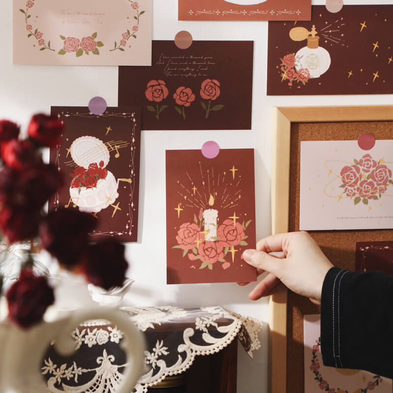 Zestaw kart pocztowych w stylu vintage z romantycznymi różami. 30 estetycznych grafik przedstawiających vintage róże, cytaty oraz motyle. Te plakaty będą doskonałą dekoracją ścienną dla miłośników stylu coquette lub dark academia.