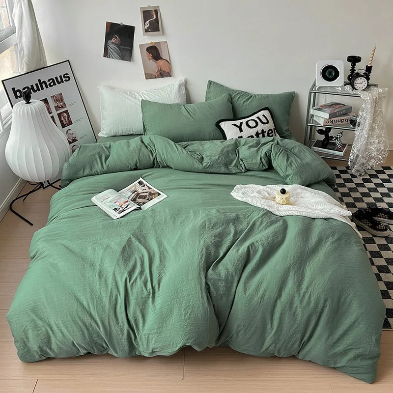Minimalistyczny i prosty komplet pościeli z poszwą na kołdrę, wykonany z jednokolorowej, marszczonej tkaniny. Idealny dla miłośników minimalizmu i osób nieprzepadających za prasowaniem.