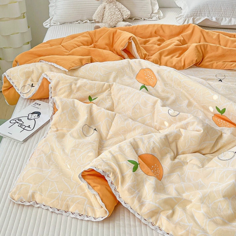 Bardzo miękka i przytulna kołdra narzuta. Uroczy nadruk z pomarańczowych kreskówek sprawia, że jest idealnym dodatkiem do kawaii oraz kidcore inspirowanych sypialni.