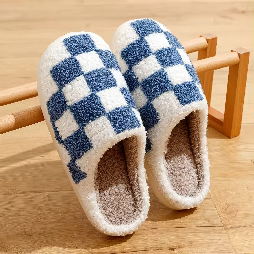 Urocze miękkie pluszowe domowe kapcie w kratę