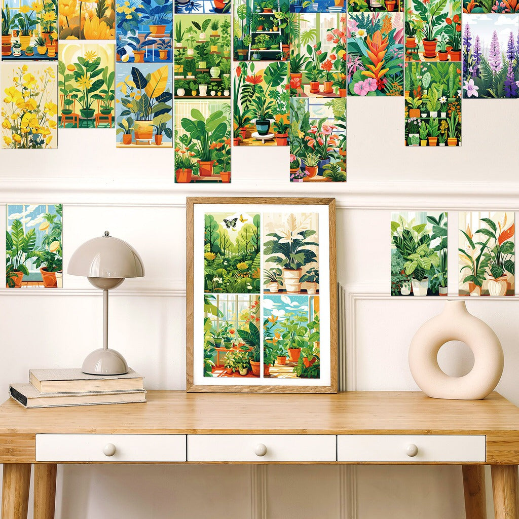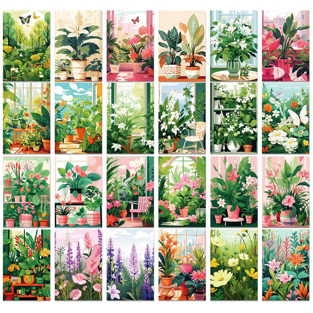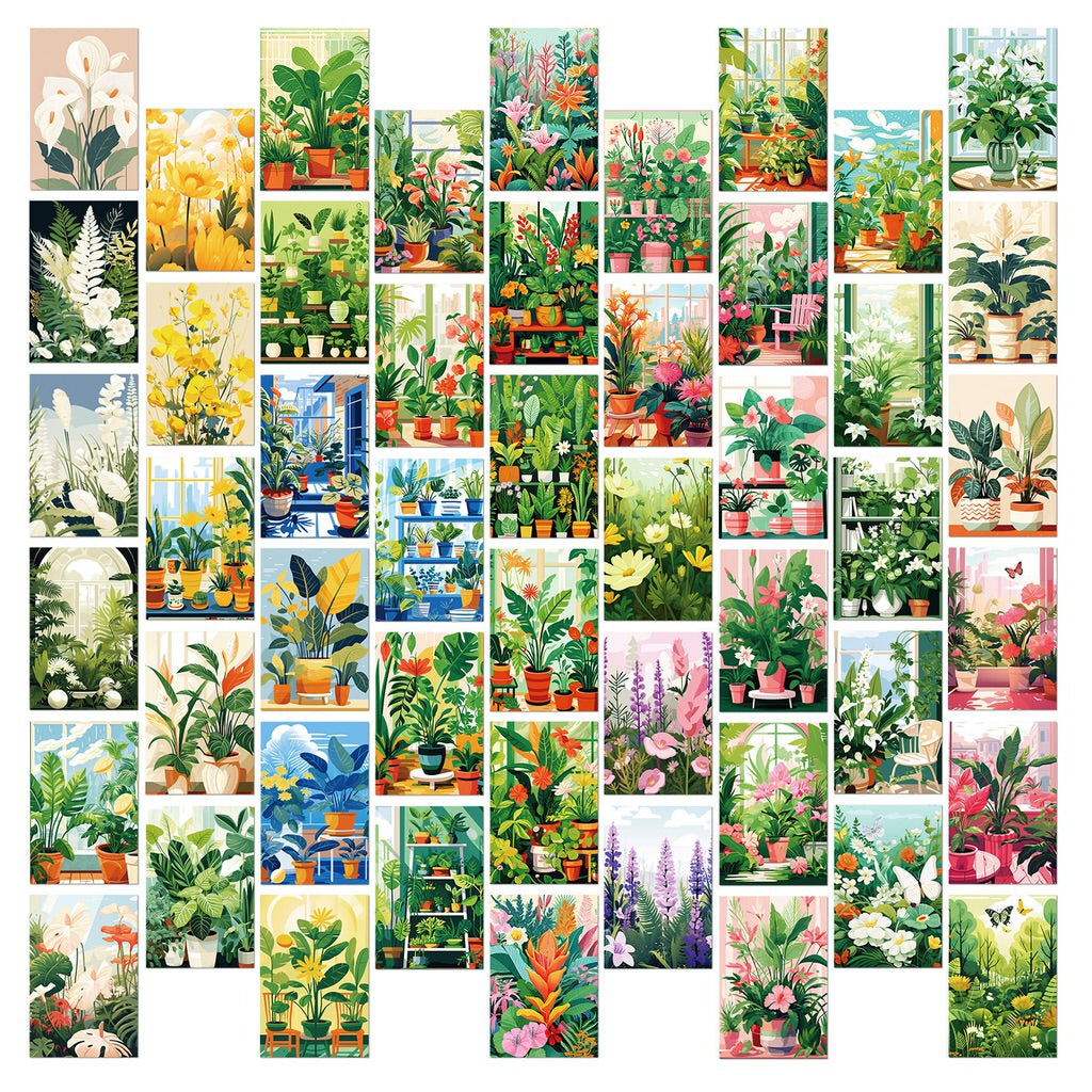 Zestaw kart do kolażu ściennego z motywem kwiatów w doniczkach, cyfrowy nadruk. 50-częściowy zestaw estetycznych grafik na ścianę.