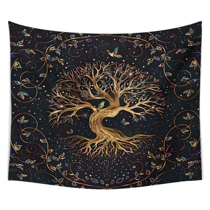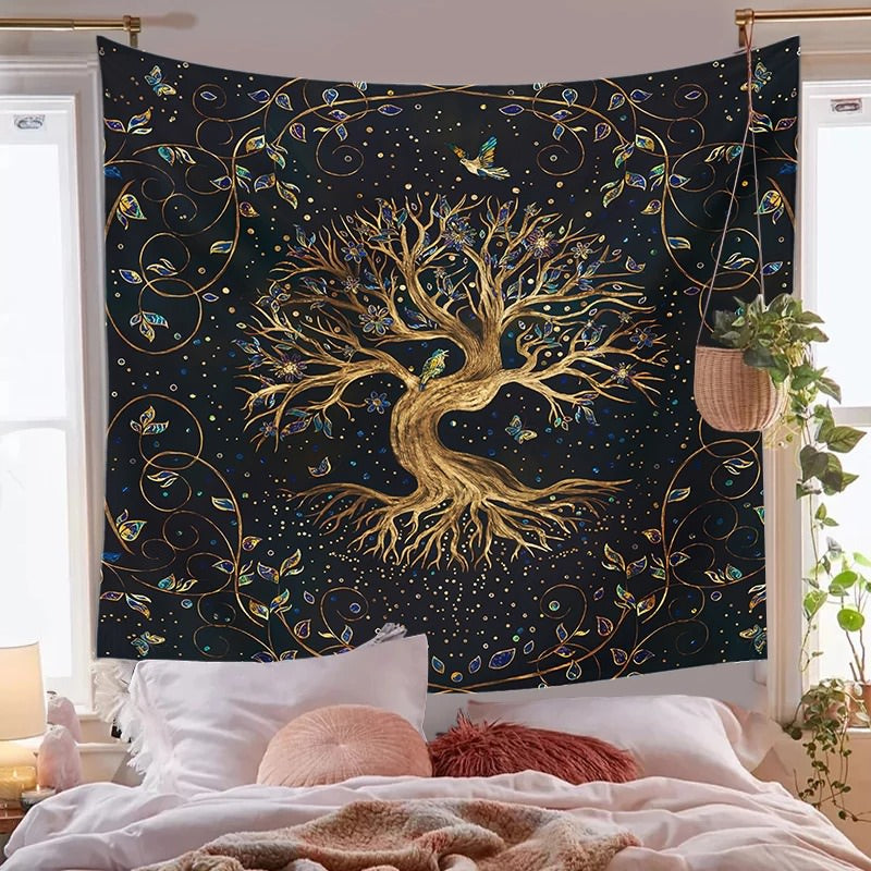 Złocisty gobelin ze wzorem drzewa życia w estetycznym stylu. Doskonały do powieszenia na suficie nad łóżkiem. Gobeliny ścienne potrafią odmienić styl pokoju w zaledwie minutę! Lekki do zawieszenia na ścianie lub suficie, a jednocześnie wytrzymały, dzięki czemu sprawdzi się także jako koc piknikowy lub obrus.
