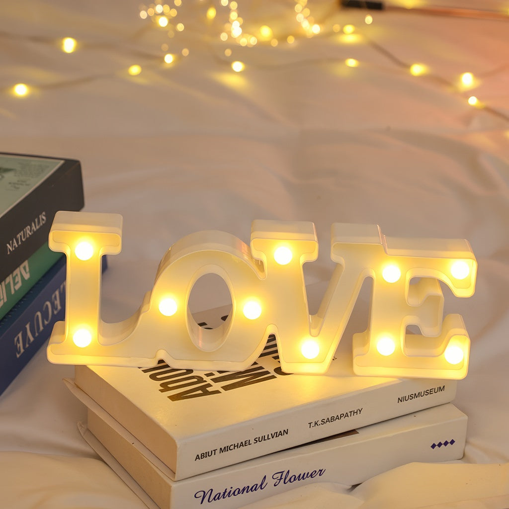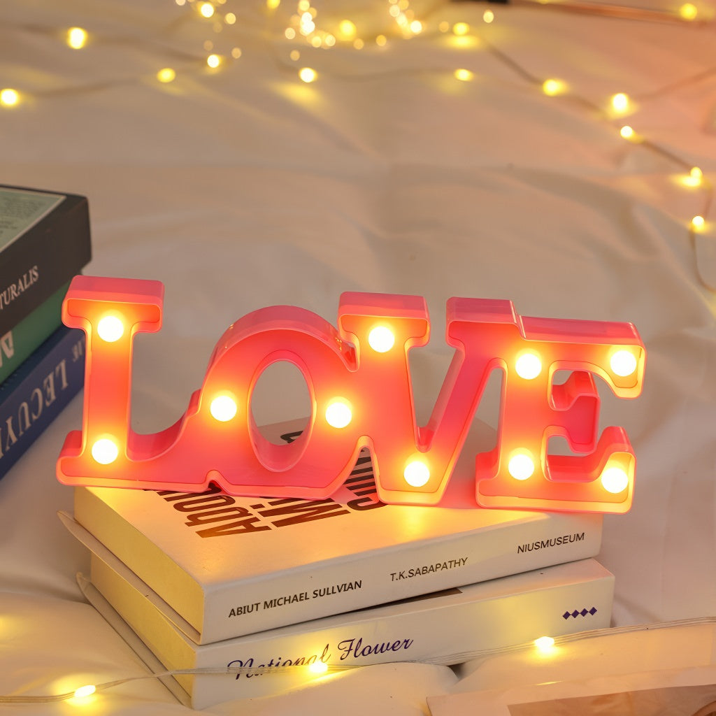 Dekoracyjna lampka w kształcie słowa „LOVE”, wykonana w odważnym, blokowym stylu czcionki. Wykonana z błyszczącego plastiku, z równomiernie rozmieszczonymi żarówkami LED emitującymi ciepłe, białe światło. Oświetlenie to daje miękką, nastrojową poświatę.