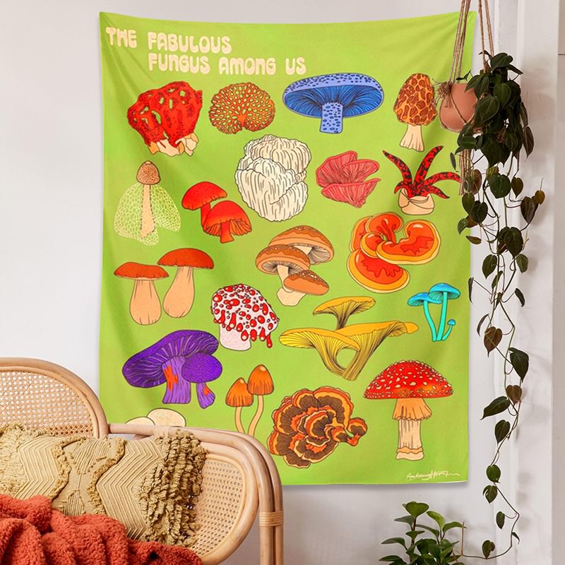 Niezależny stylowy nadruk z grzybami. Tkaniny ścienne potrafią odmienić wygląd Twojego pokoju w zaledwie chwilę! Są lekkie, łatwe do powieszenia na ścianie lub suficie, a jednocześnie trwałe, dzięki czemu świetnie sprawdzą się także jako koc piknikowy lub obrus na zewnątrz.