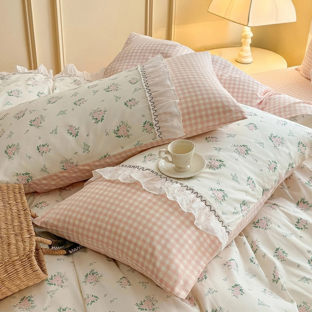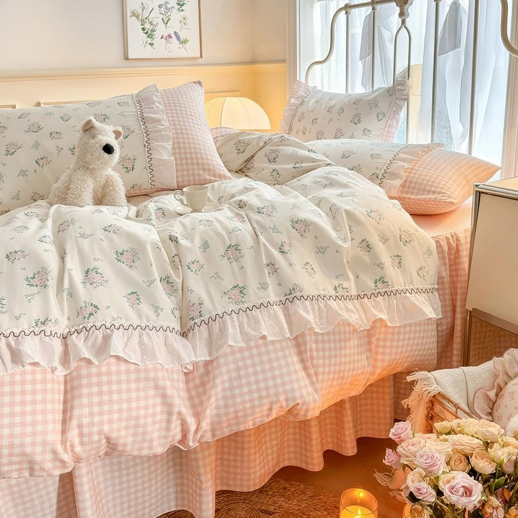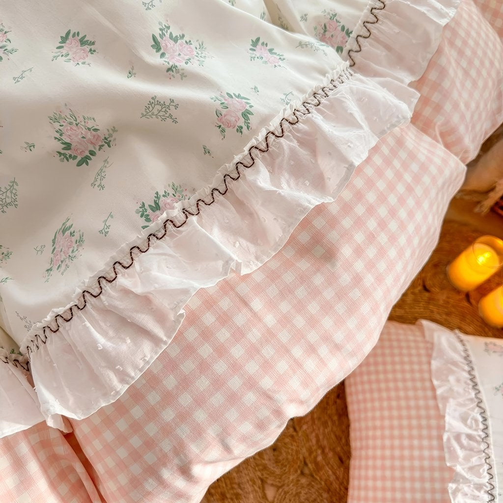 Odkryj pościel w stylu Kawaii babci z pastelową, kratkowaną gingham, ozdobioną bujnymi koronkowymi falbankami. Idealnie sprawdzi się w przytulnych, miękkich aranżacjach w stylu cottage. Wzór inspirowany vintage i białe koronkowe falbanki doskonale wpisują się zarówno w pokoje kawaii, jak i cottagecore. Lekka tkanina jest przewiewna i zapewnia komfort przez cały rok.