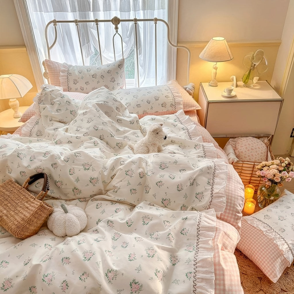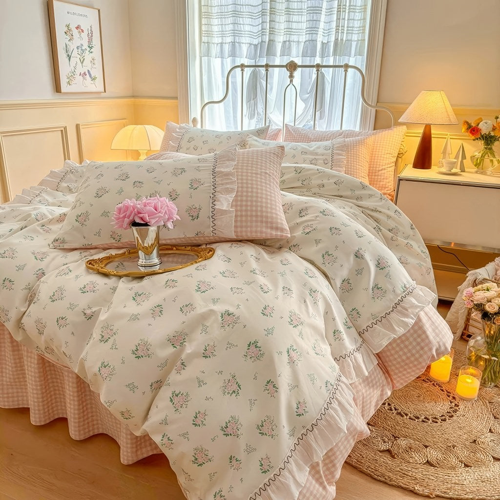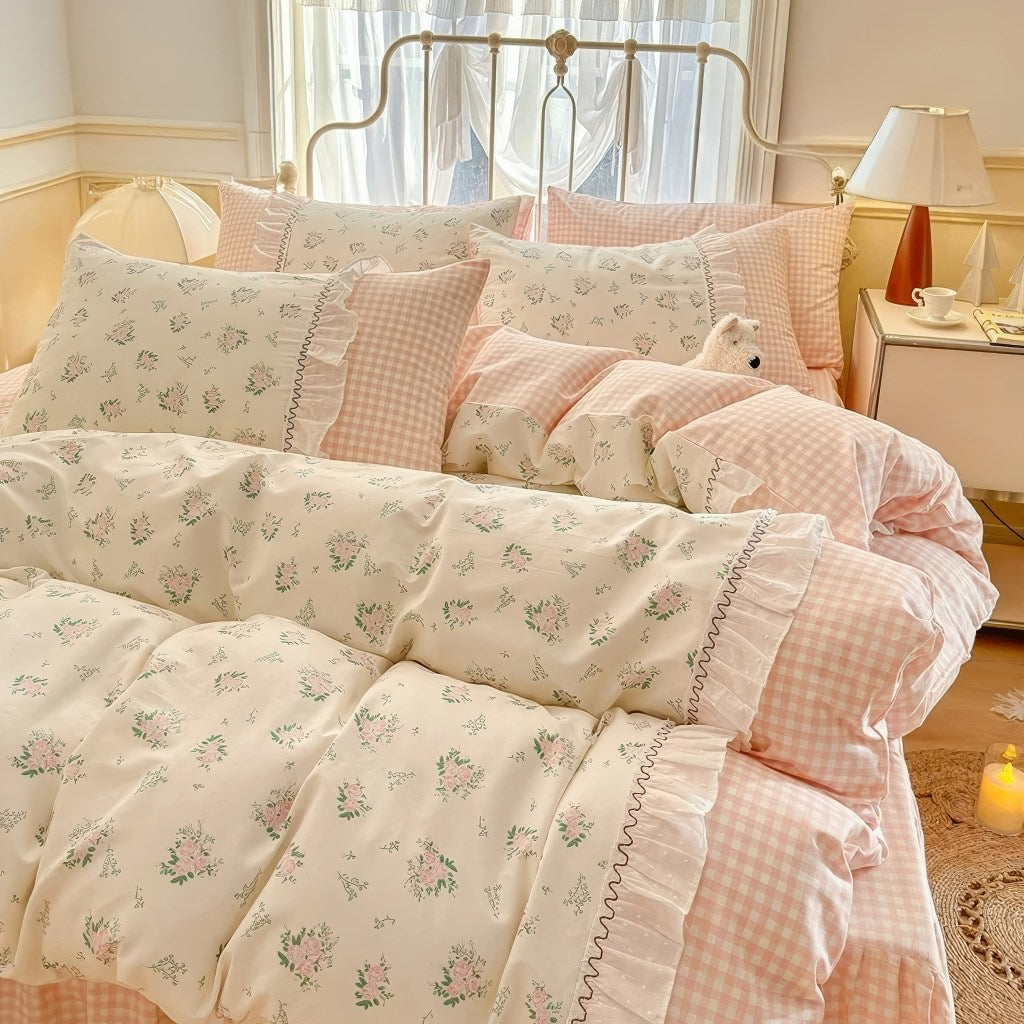 Odkryj pościel w stylu Kawaii babci z pastelową, kratkowaną gingham, ozdobioną bujnymi koronkowymi falbankami. Idealnie sprawdzi się w przytulnych, miękkich aranżacjach w stylu cottage. Wzór inspirowany vintage i białe koronkowe falbanki doskonale wpisują się zarówno w pokoje kawaii, jak i cottagecore. Lekka tkanina jest przewiewna i zapewnia komfort przez cały rok.
