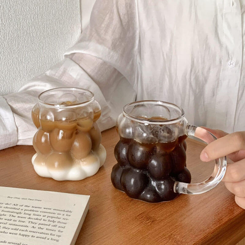 Doświadcz swoich ulubionych napojów kawowych w większym, bardziej wyrazistym stylu dzięki temu szklanemu kubkowi Bubble! To doskonały dodatek do wnętrz w klimacie dark academia lub o estetyce szałwiowej zieleni. Dostępny w dwóch wersjach: z uchwytem lub bez. Przenieś swoje kawowe przygody na wyższy poziom!