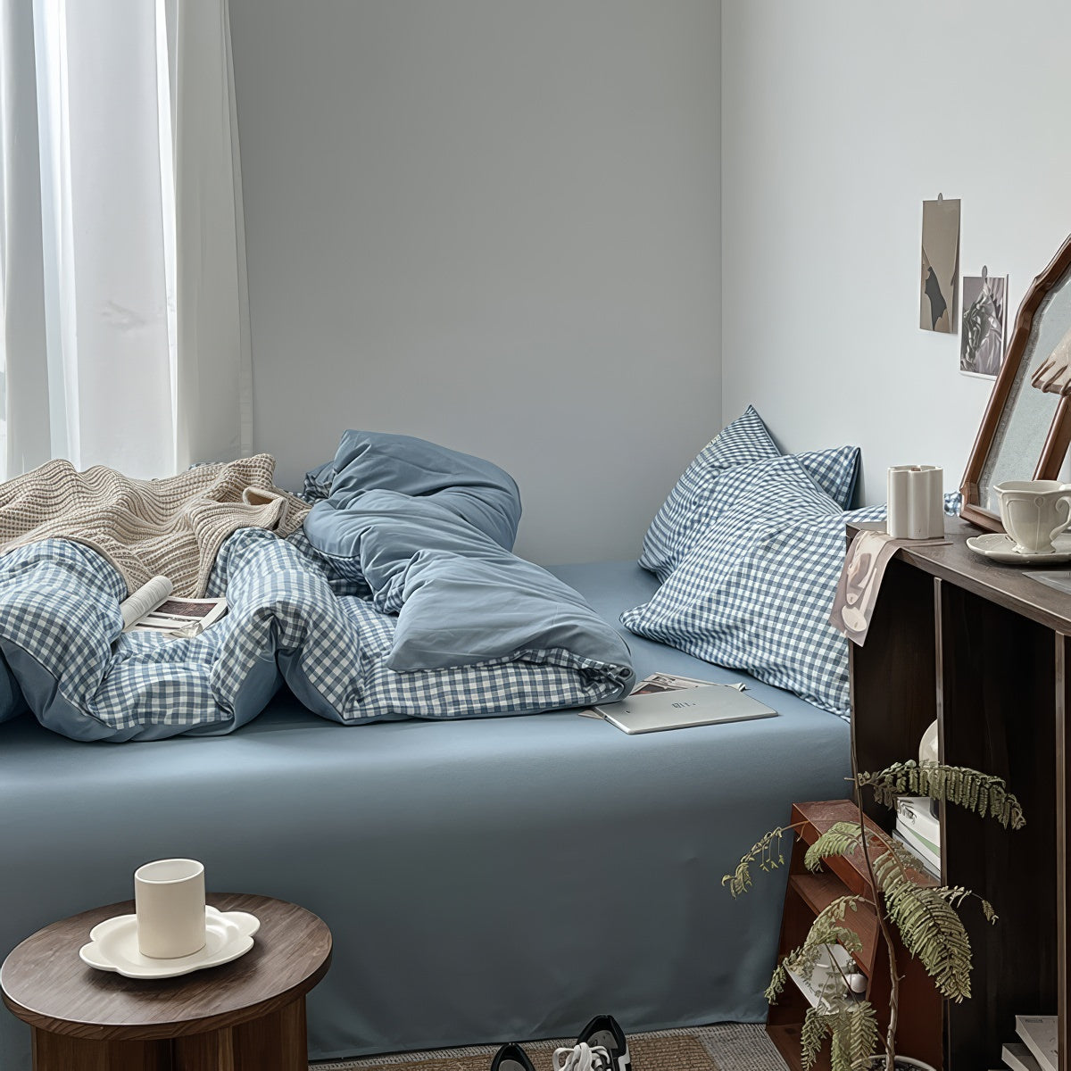 Świeża i lekka, ta pościel w jasnoniebieską kratkę wnosi do każdego pomieszczenia radosny i czysty akcent. Poszwa na kołdrę oraz poszewki na poduszki ozdobione są delikatnym wzorem w błękitno-białą kratę, a dopasowane prześcieradło w jednolitym niebieskim kolorze tworzy spójną i uporządkowaną całość. Subtelna faktura tkaniny zapewnia komfort bez zbędnego przepychu — idealny wybór do spokojnych, luźnych wnętrz. Doskonałe do aranżacji: danish pastel, coastal, clean girl lub light academia.