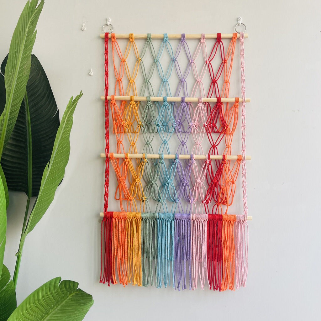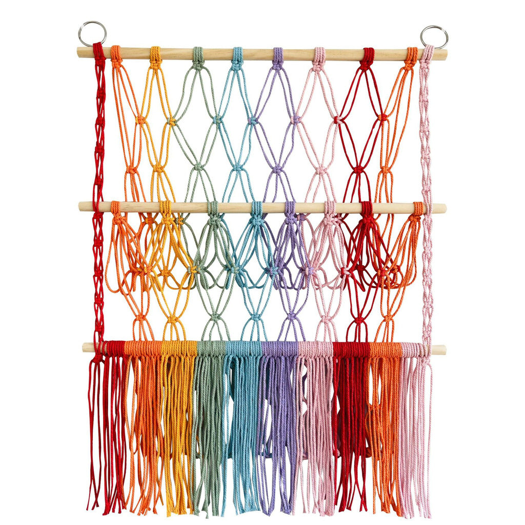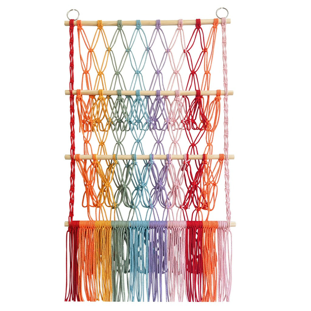 Dodaj odrobinę koloru i porządku do każdego pomieszczenia dzięki tej żywej makramowej zawieszce w formie tęczy. Ręcznie wykonana z mieszanki miękkich, trwałych sznurków w gradientowych odcieniach tęczy, zachwyca efektownym wyglądem i funkcjonalnością. Wyposażona w kilka poziomów, oferuje dużo miejsca na pluszaki, akcesoria czy lekkie przedmioty, pomagając utrzymać przestrzeń w stylowym porządku. Doskonała do pokoju dziecięcego, pokoju niemowlęcia lub przytulnego kącika do czytania – wprowadza odrobinę boho-chicowego charakteru do każdego wnętrza. Przyciągające wzrok kolory i misterny splot czynią ją niezbędnym dodatkiem dla tych, którzy cenią sobie połączenie zabawy z uporządkowaniem.