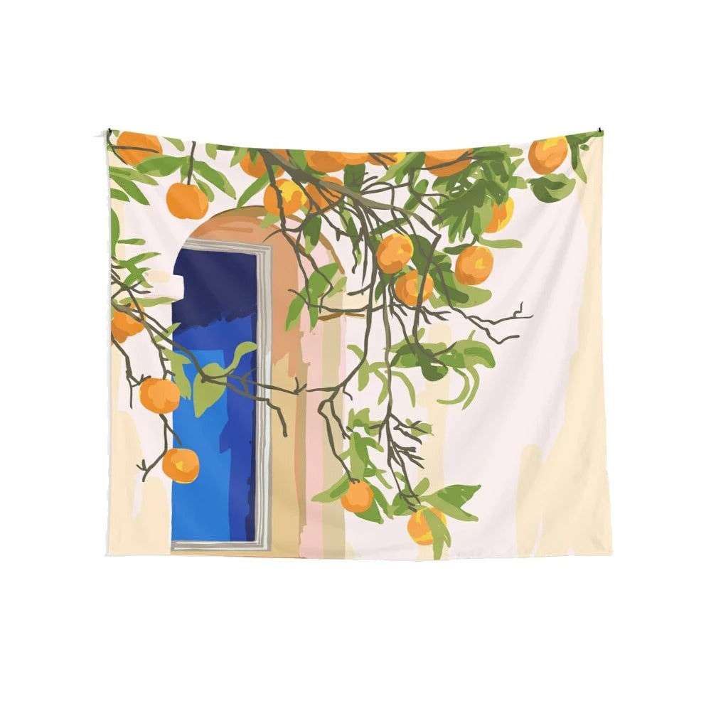 Artystyczny plakat z mandarynkami śródziemnomorskimi na drzewie oraz niebieskim oknem w tle. Tkaniny dekoracyjne na ścianę potrafią odmienić styl Twojego pokoju w zaledwie chwilę! Lekka tkanina, którą łatwo zawiesić na ścianie lub suficie, a także trwała – nadaje się także jako koc na zewnątrz lub obrus.