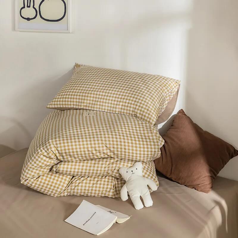 Komplet pościeli z poszewką na kołdrę w mini kratkę w pastelowych odcieniach: poszewka na kołdrę + prześcieradło płaskie + poszewka na poduszkę. Super miękka i przyjemna dla skóry oraz łatwa w pielęgnacji. Doskonale pasuje do sypialni w stylu dark academia, sage green, vanilla girl oraz większości minimalistycznych aranżacji.