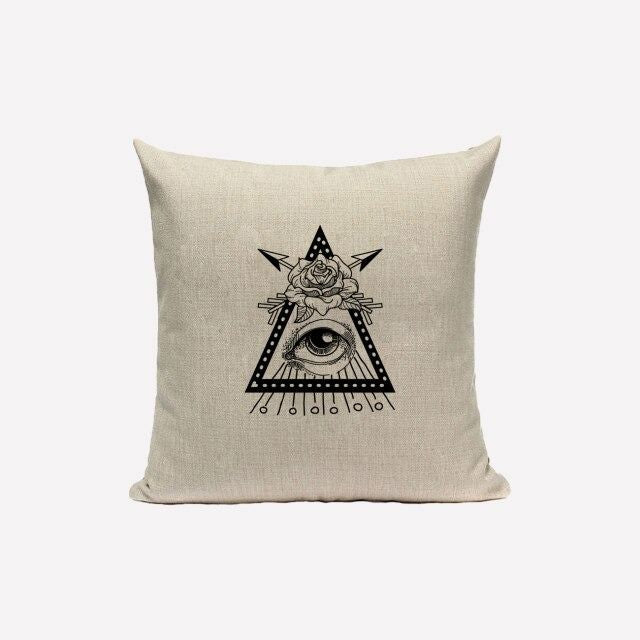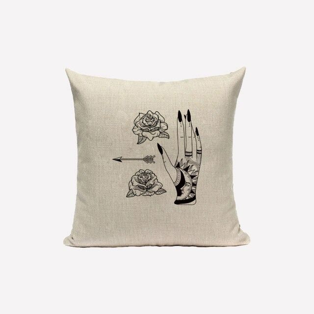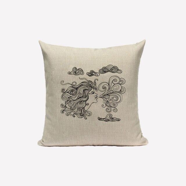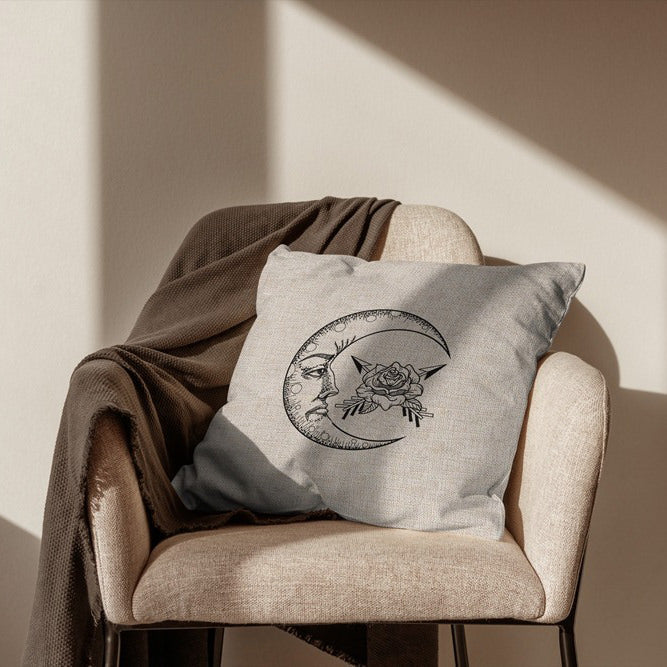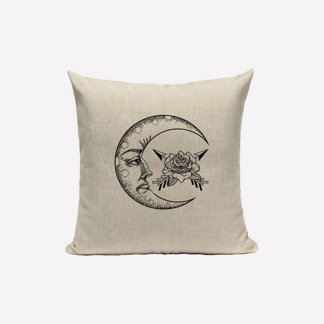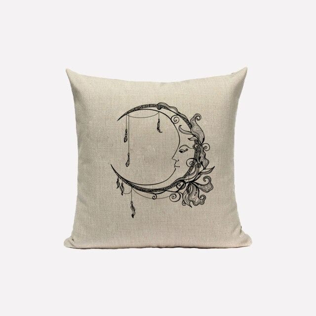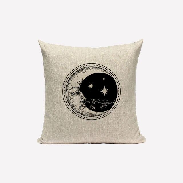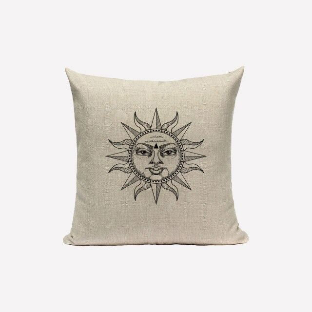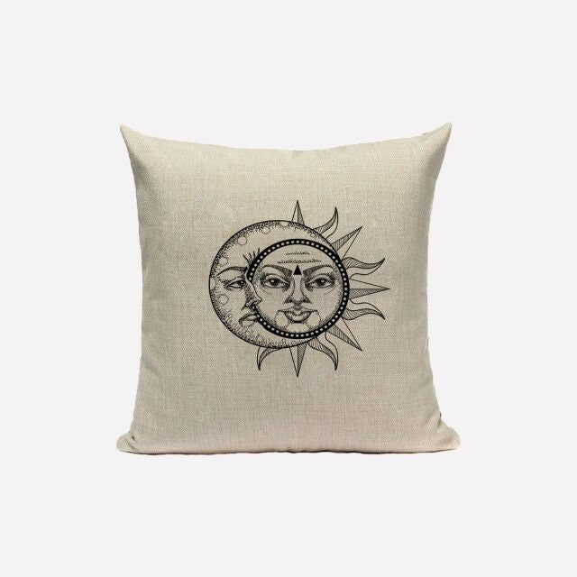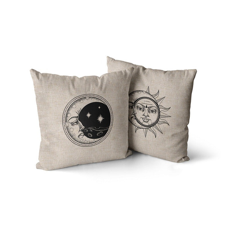 Astrologiczna kolekcja estetycznych poszewek na poduszki. Jednostronny monochromatyczny nadruk w stylu vintage przedstawiający słońce i księżyc. Idealna do wnętrz w klimacie czarownic, wróżek lub astrologicznych.