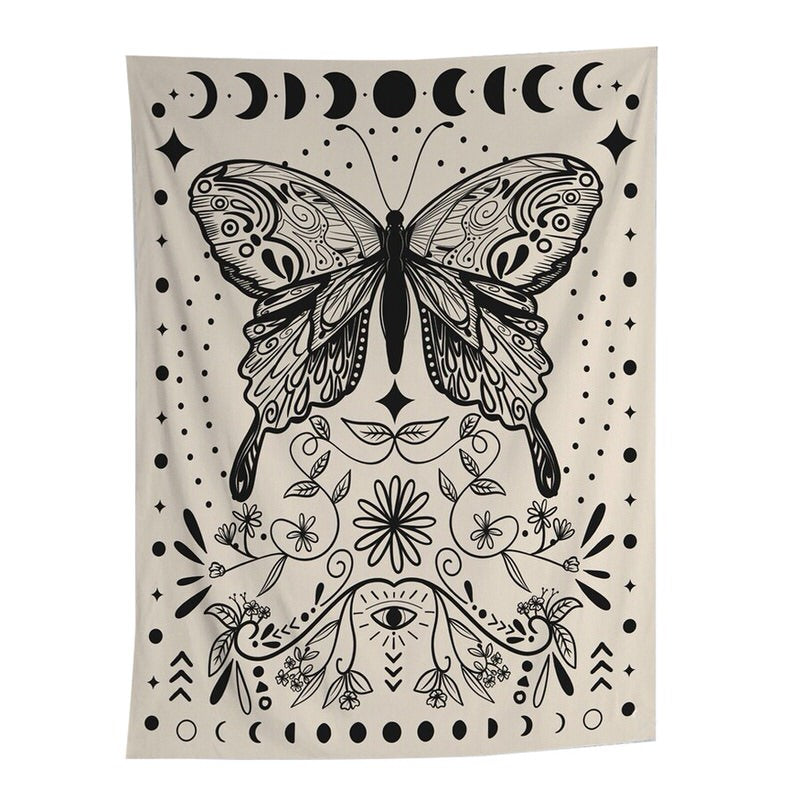 Estetyczna tkanina dekoracyjna z czarno-białym nadrukiem nocnego motyla, faz księżyca, gwiazd i nocnej flory. Możesz użyć jej jako narzuty na łóżko, dekoracji na sufit lub ścianę. Idealna do wystroju pokoju w stylu boho lub wróżkowym.
