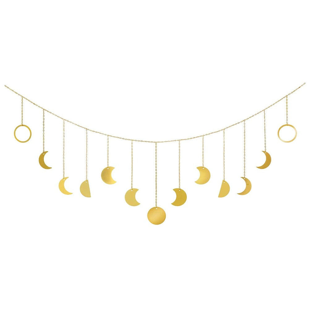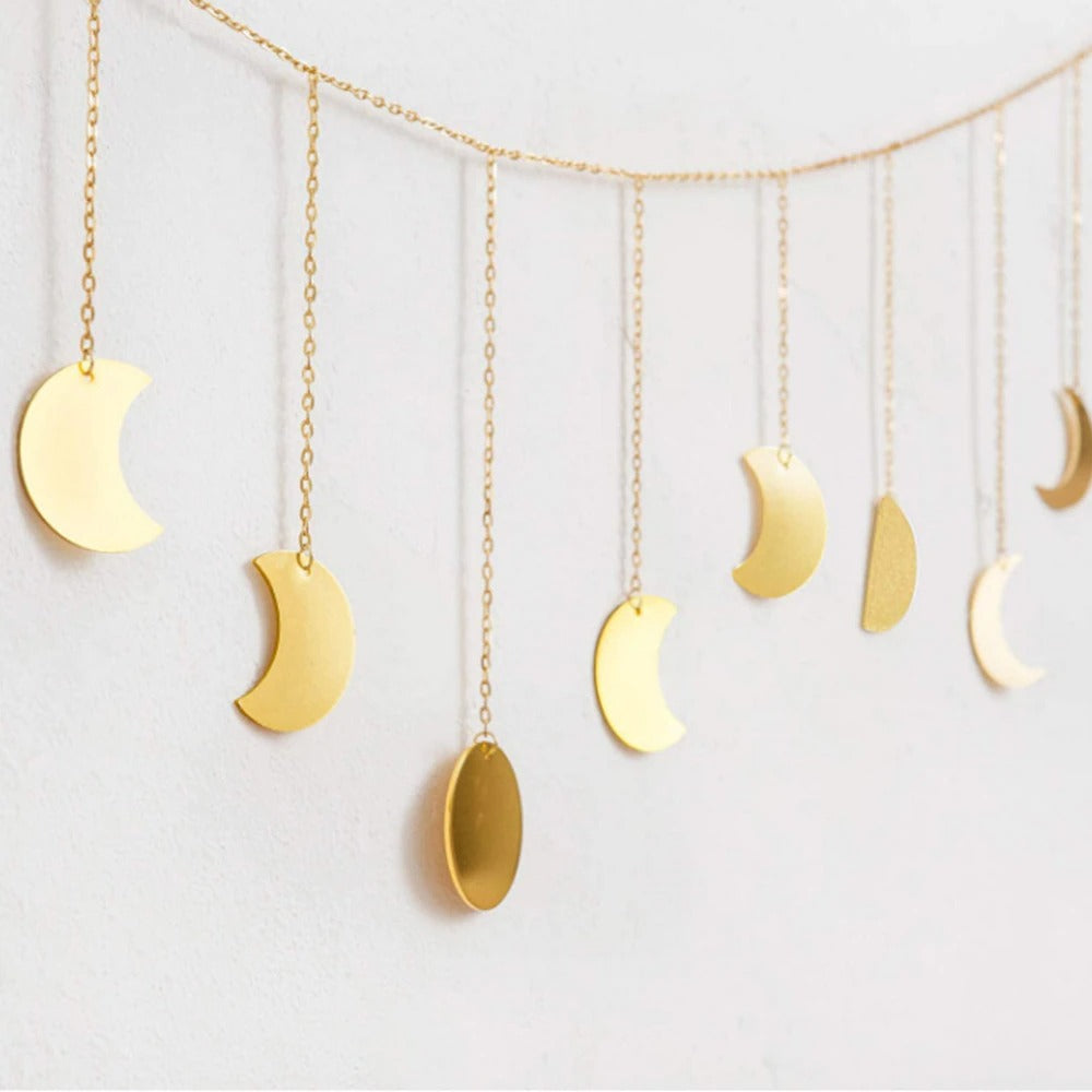 Wprowadź delikatny, boho akcent do swoich ścian. 13 pięknych złotych metalowych zawieszek na wysokiej jakości złotym łańcuszku, przedstawiających fazy Księżyca.