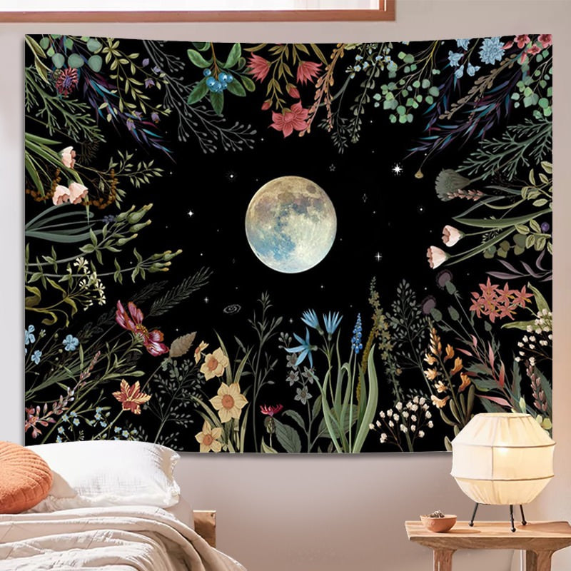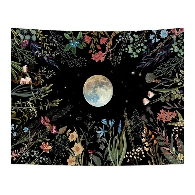 Nocny księżyc, kwiatowy ogród, estetyczna tkanina dekoracyjna na ścianę. Idealna do zawieszenia na suficie nad łóżkiem. Tkaniny ścienne potrafią odmienić styl Twojego pokoju w zaledwie minutę! Lekka, łatwa do powieszenia na ścianie lub suficie, a także trwała, by używać jej jako koca na zewnątrz lub obrusa.