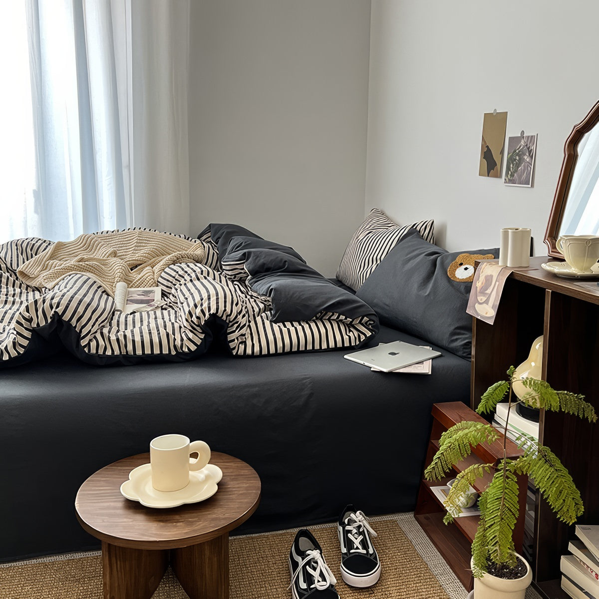 Połącz tę pościel z naturalnym drewnem, neutralnymi pledami oraz delikatnym oświetleniem, by podkreślić jej klasyczny charakter. Idealna do stworzenia spokojnej, przytulnej atmosfery — niezależnie od tego, czy urządzasz nowoczesne mieszkanie, pokój w stylu nadmorskim, czy codzienne domowe zacisze.