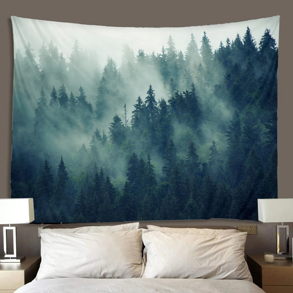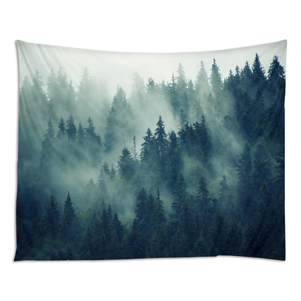 Tkanina ścienna z nadrukiem mglistych, nordyckich, zamglonych lasów. Dostępna w bardzo dużych rozmiarach.