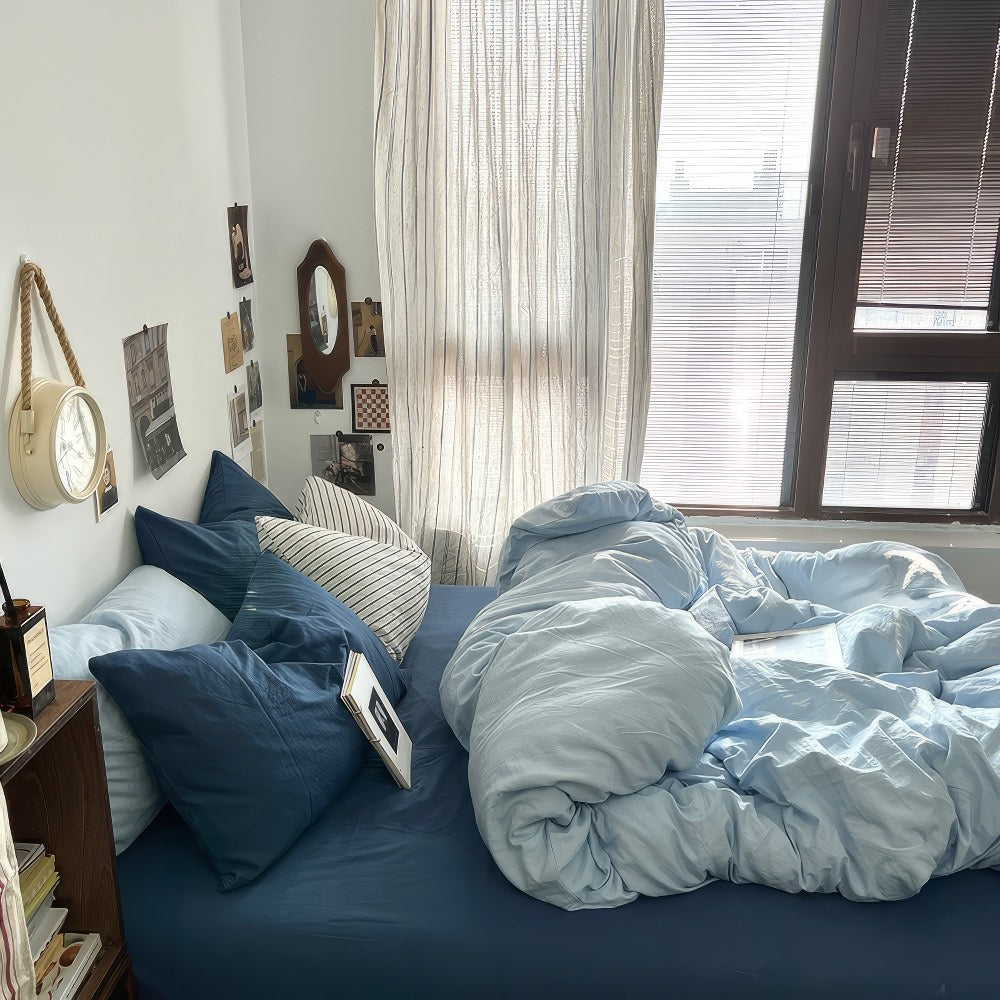 Estetyczna pościel z motywem oceanu w odcieniach niebieskiego. Idealnie pasuje do wnętrz w stylu plażowym, minimalistycznych pokojów oraz sypialni inspirowanych żeglarstwem.