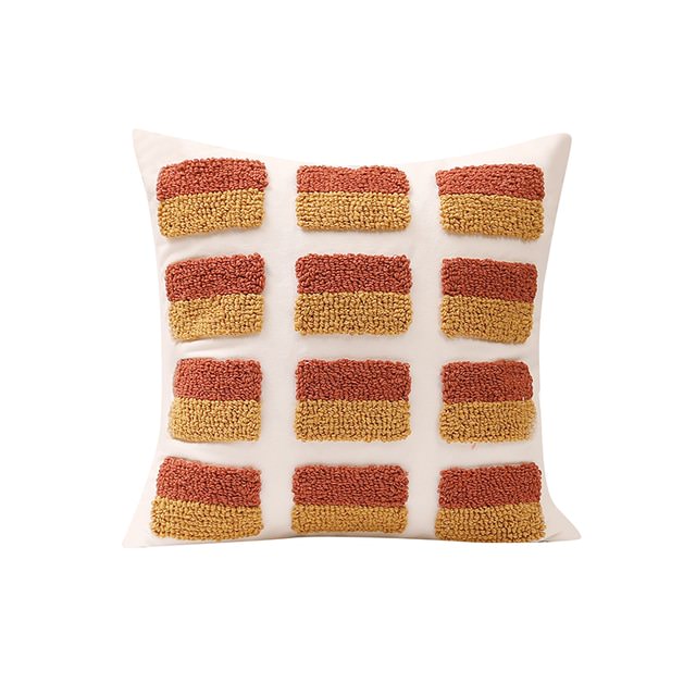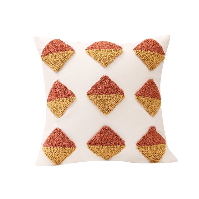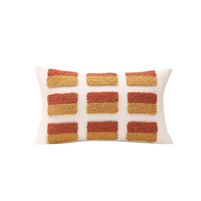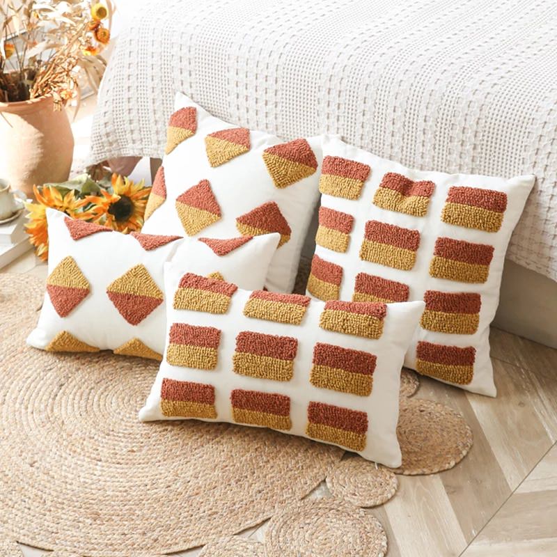 Dwukolorowe ochrowe poszewki na poduszki typu boho z tuftowanym wzorem. Haftowany geometryczny print na górnej stronie oraz miękka lniana tkanina na spodzie z ukrytym zamkiem błyskawicznym. Idealne do wnętrz w stylu boho.