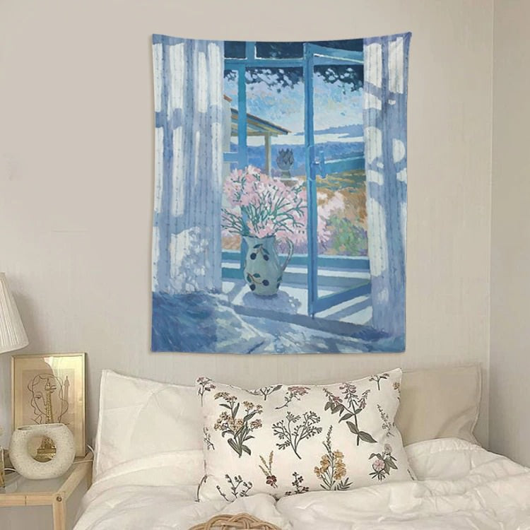 Uroczy gobelin ścienny imitujący okno, malowany farbami olejnymi w niebieskich tonacjach. To jeden z naszych najbardziej unikatowych gobelinów.