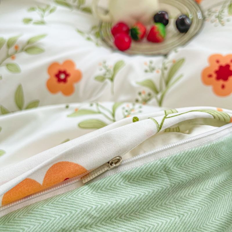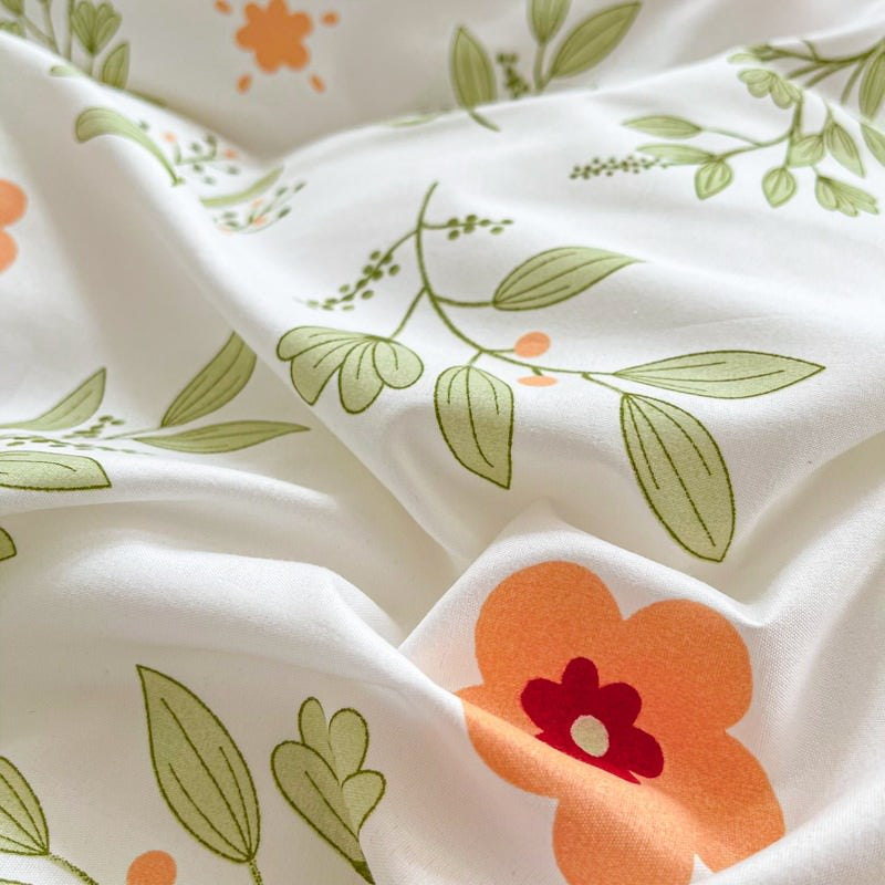 Dodaj odrobinę koloru do swojej sypialni dzięki tej pościeli w pomarańczowe kwiaty. Piękny wzór pomarańczowych kwiatów natychmiast odmieni estetykę Twojego pokoju. Zestaw doskonale pasuje do stylu cottagecore oraz wielu innych aranżacji wnętrz.