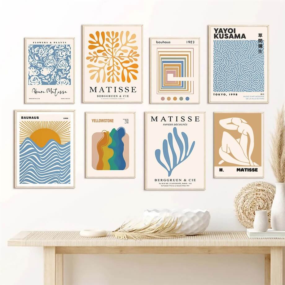 Ozdób ściany swojego pokoju tymi plakatami na płótnie inspirowanymi słynnymi wycinankami Matisse’a w estetycznej kolorystyce bladego pomarańczu i błękitu. Te plakaty galerii ściennej doskonale sprawdzą się w pokojach o stylu eklektycznym, vintage oraz w wielu innych aranżacjach estetycznych.