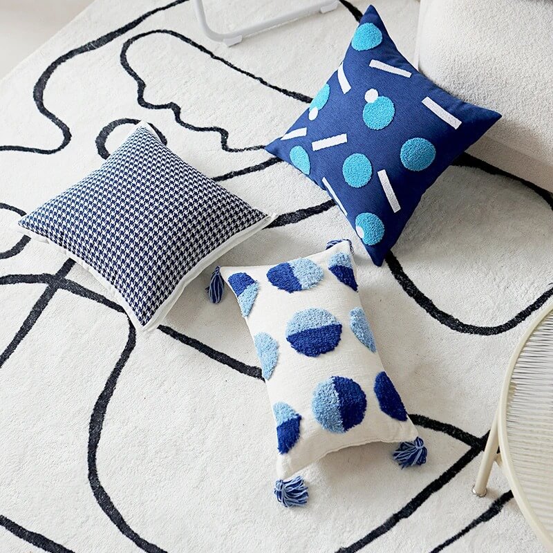 Kolekcja estetycznych poszewek na poduszki w odcieniach niebieskiego. Ozdoby z tuftu, frędzle, chwosty, gładkie i wzorzyste – łącz je razem, by uzyskać najlepszy efekt! Wykonane z gęstego, grubego płótna bawełnianego lub poliestru (w zależności od stylu). Idealne do dekoracji pokoju w estetyce preppy.