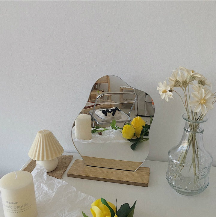 - Materiał: lustro akrylowe, drewniana podstawka