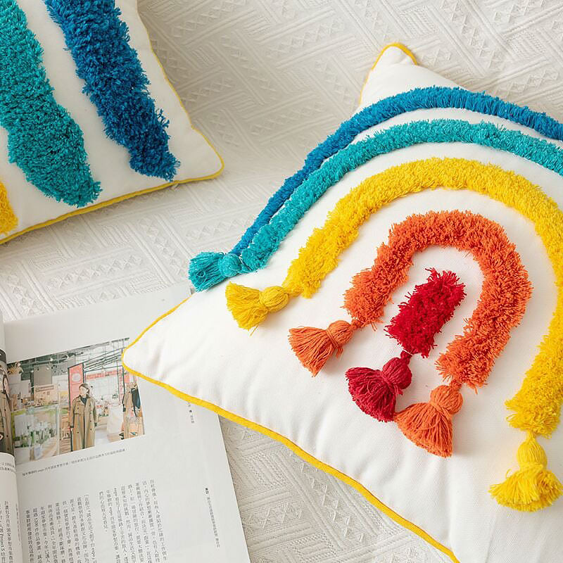 Jasna, haftowana kolekcja estetycznych poszewek na poduszki z uroczymi, tęczowymi chwostami wyszywanymi na całej górnej stronie dekoracyjnej poszewki. Wykonana z gęstego, grubego płótna bawełnianego. Idealna do wystroju pokoju w stylu boho lub pastelowego stylu duńskiego.