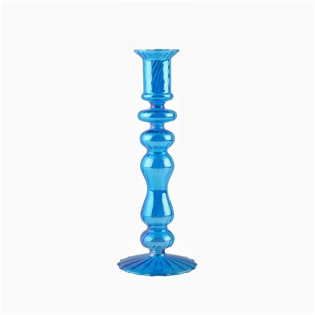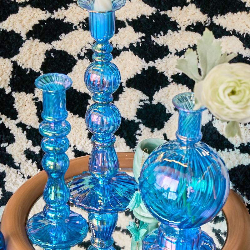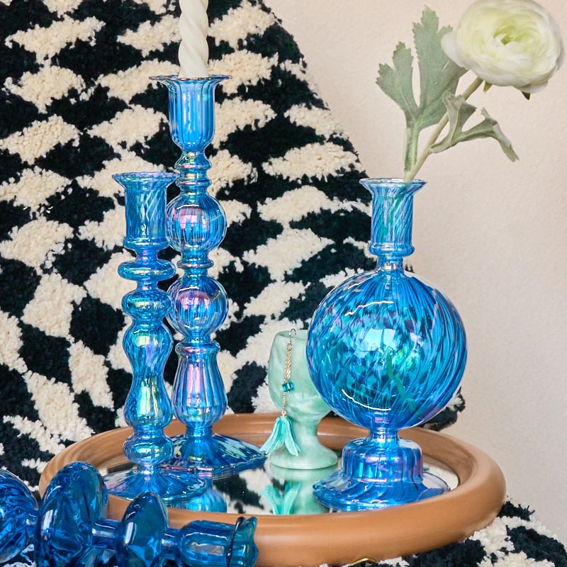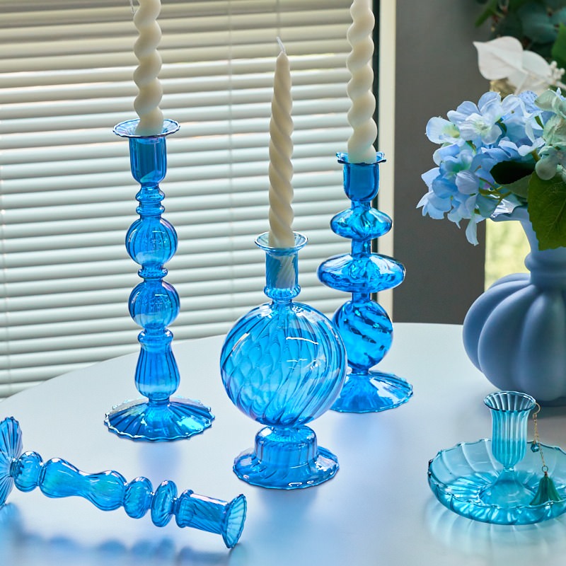 Dodaj akcenty głębokiego, morskiego błękitu dzięki tym ręcznie wykonanym szklanym świecznikom. Będą one mienić się w promieniach słońca, wypełniając Twój pokój olśniewającą, błękitną aurą. Wybierz 2-4 sztuki dla lepszego efektu — stwórz estetyczny zestaw świeczników!