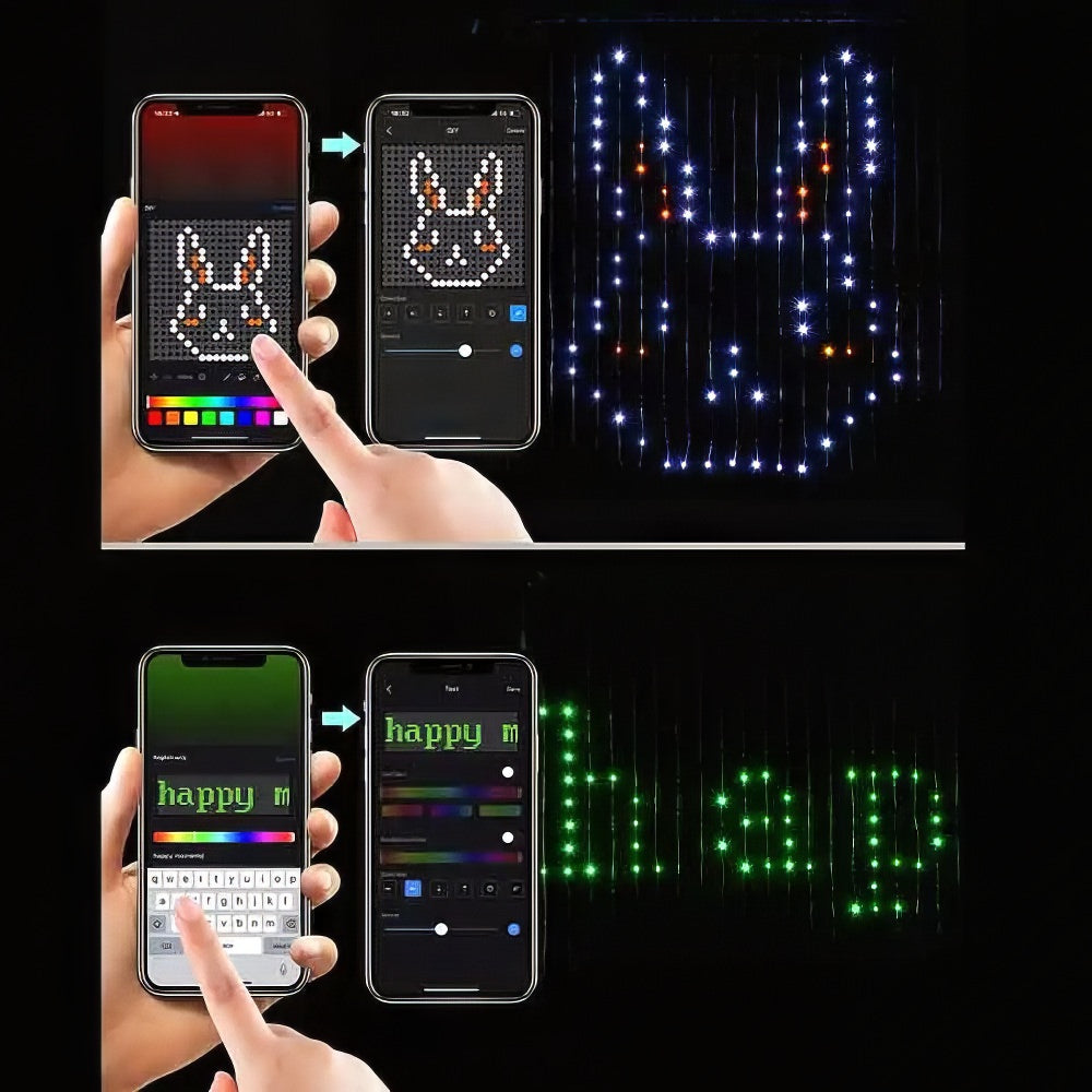 Oświetl swój pokój dzięki Inteligentnym Kurtynowym Lampkom LED typu „Fairy”. Idealne jako dekoracja sypialni, lampki te tworzą kolorową i estetyczną atmosferę. Łatwe w sterowaniu za pomocą telefonu, mogą wyświetlać różne GIF-y, wzory i kolory. Rysuj i ciesz się niepowtarzalnym efektem magicznych lampek. Doskonałe do zawieszenia jako kurtyna w oknie, aby łatwo dzielić się nastrojem z rodziną i sąsiadami.