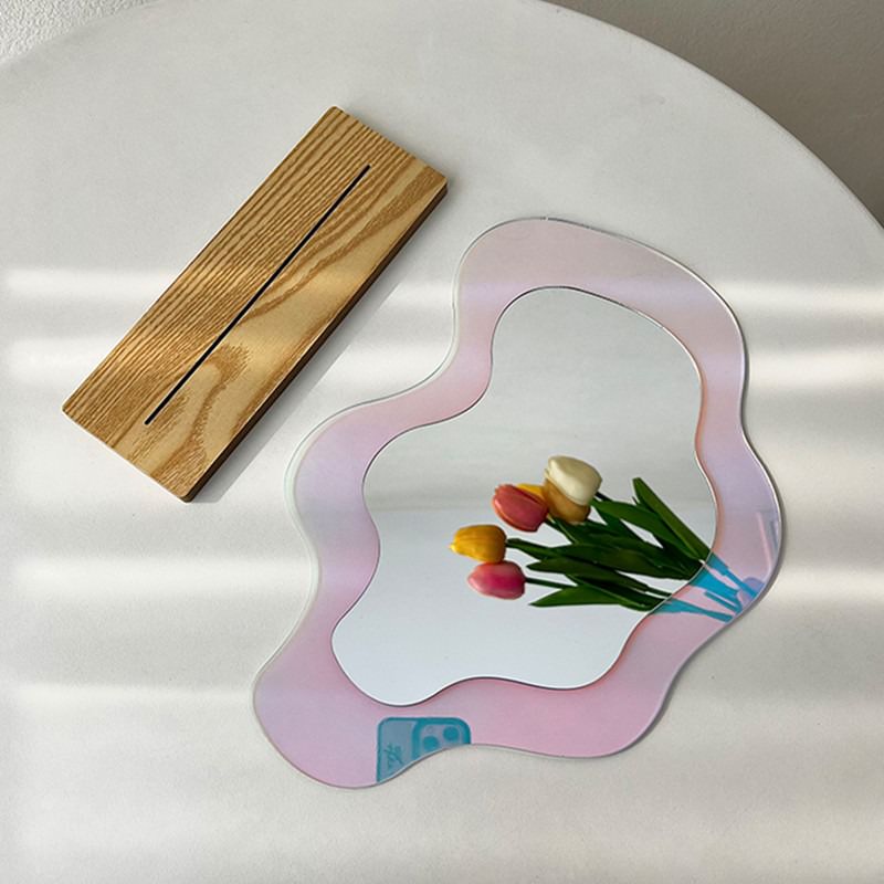- Zestaw zawiera: 1x Nieregularne Lustro Akrylowe, 1x Drewniana podstawka