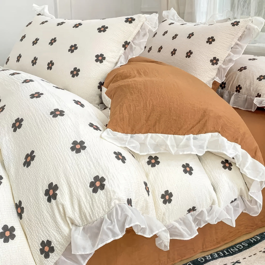 Idealny na wiosnę komplet pościeli z poszwą na kołdrę. Ten zestaw pościeli posiada białą bazę z rozsianym kwiatowym wzorem, składającym się z drobnych ciemnych kwiatów z pomarańczowymi środkami. Tkanina jest teksturowana, co dodaje powierzchni wymiaru. Każdy element jest wykończony delikatnymi białymi falbankami, nadającymi całości miękki i kobiecy charakter. Ciepłe, ceglastopomarańczowe akcenty, w tym wewnętrzna strona poszwy na kołdrę, stanowią kontrastowy, wyrazisty dodatek kolorystyczny. Zestaw inspirowany jest przytulnym stylem farmhouse/cottagecore, podkreślając urok i ciepło. Całość wygląda jasno, świeżo i nieco vintage.