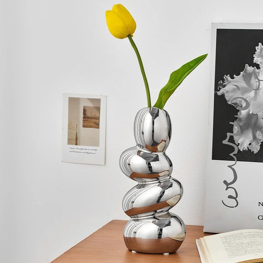 Dodaj odrobinę współczesnego blasku do swojego wnętrza dzięki tej unikalnej, inspirowanej kamykami wazie, którą można układać w stos! Idealna do prezentowania słonecznego tulipana lub ulubionego kwiatu, ta waza o lustrzanym połysku dostępna w kolorze czarnym lub białym stanowi samodzielny element dekoracyjny. Jej smukły design i refleksyjne powierzchnie pięknie odbijają światło, czyniąc ją ozdobą godną centralnego miejsca w każdym nowoczesnym pomieszczeniu. Rozświetl kąt pokoju lub nadaj swoim stołom nowoczesnego charakteru dzięki tej przyciągającej wzrok ceramicznej wazie.