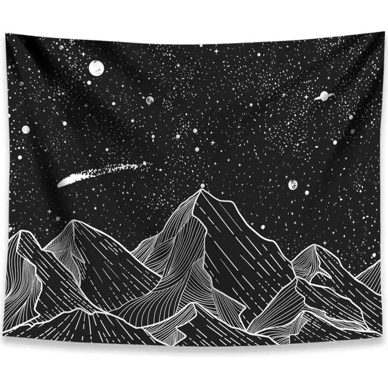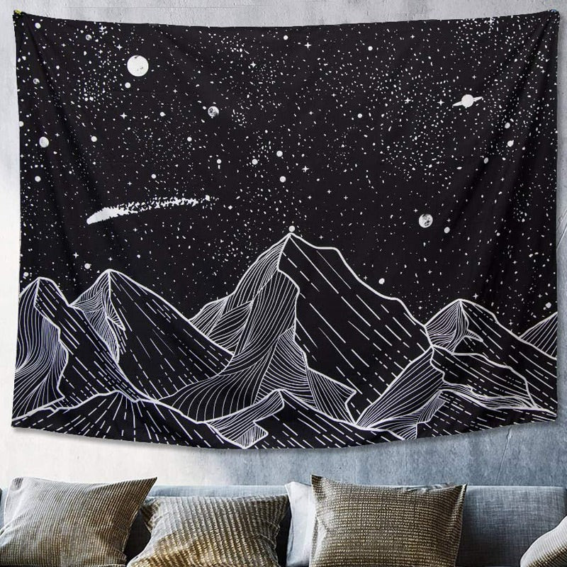 Czarno-biały konturowy nadruk gór na tle gwiaździstego nocnego nieba. Gobeliny ścienne potrafią odmienić wygląd Twojego pokoju w zaledwie minutę! Lekki materiał ułatwia zawieszenie na ścianie lub suficie; gobelin jest też trwały w użyciu jako koc na zewnątrz lub obrus.