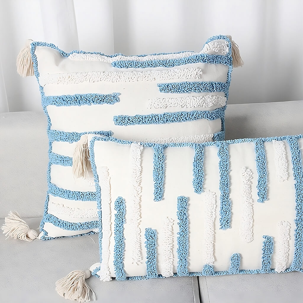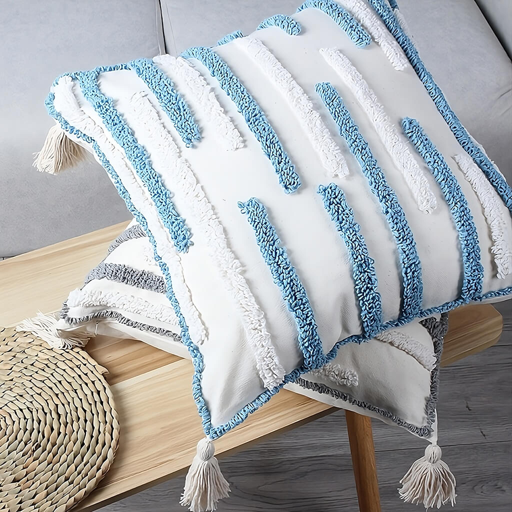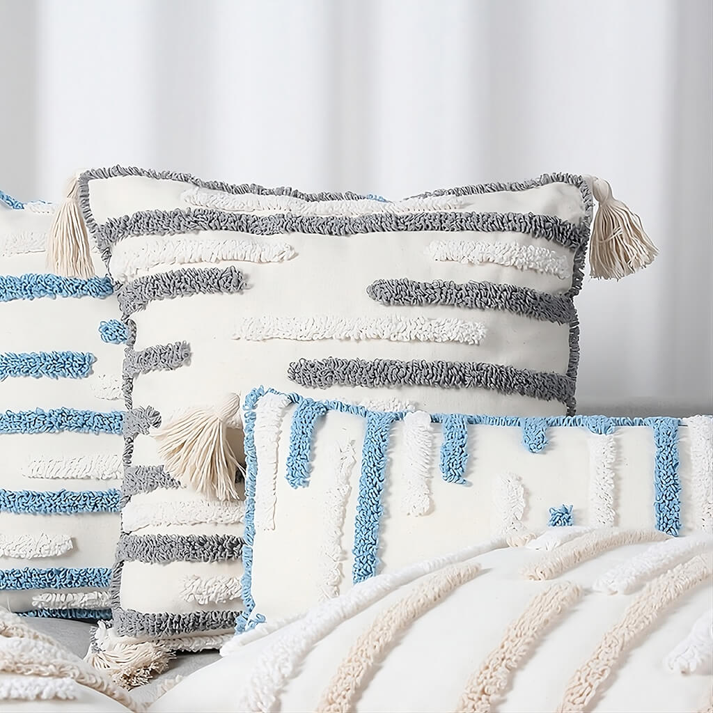 Te przytulne poszewki na poduszki wyróżniają się teksturowanym, liniowym wzorem w miękkich, ziemistych odcieniach niebieskiego, szarego i beżu. Puszyste detale oraz zabawne frędzle w rogach dodają boho uroku, idealnie wprowadzając subtelne ciepło i styl do sof lub łóżek w każdym nowoczesnym, neutralnym wnętrzu.