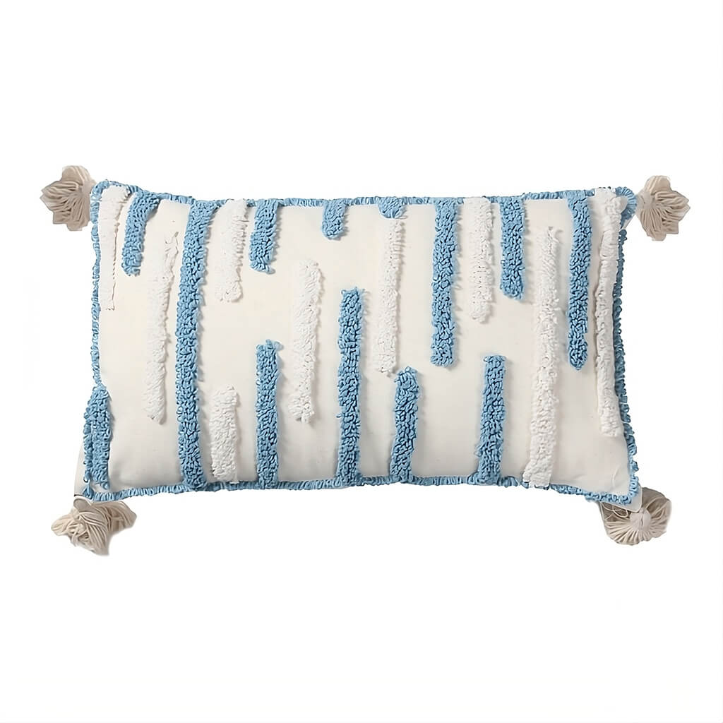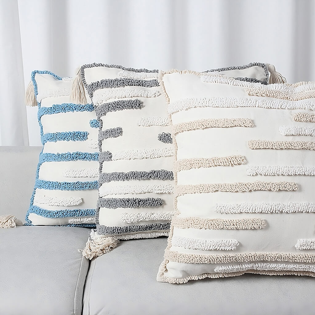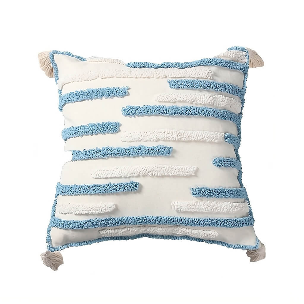 Te przytulne poszewki na poduszki wyróżniają się teksturowanym, liniowym wzorem w miękkich, ziemistych odcieniach niebieskiego, szarego i beżu. Puszyste detale oraz zabawne frędzle w rogach dodają boho uroku, idealnie wprowadzając subtelne ciepło i styl do sof lub łóżek w każdym nowoczesnym, neutralnym wnętrzu.