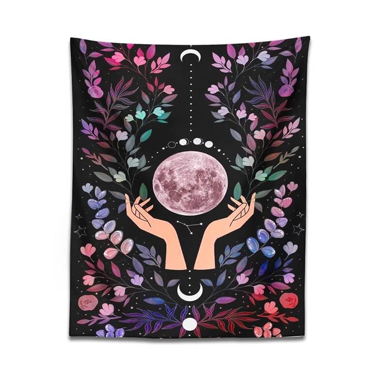 Kwiatowy gobelin ścienny z motywem „Księżyc w dłoniach”. Idealny do zawieszenia na suficie nad łóżkiem. Gobeliny ścienne potrafią całkowicie odmienić styl Twojego pokoju w zaledwie chwilę! Lekki, łatwy do powieszenia na ścianie lub suficie, a jednocześnie wytrzymały – sprawdzi się także jako koc piknikowy lub obrus na zewnątrz.