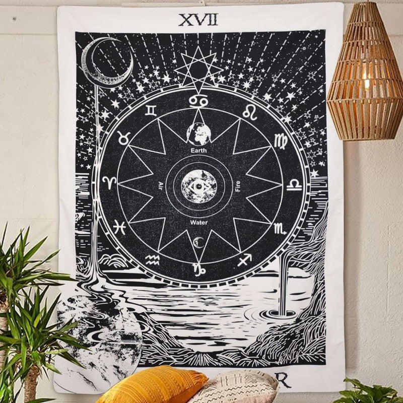 Astrologiczna, estetyczna tkanina typu gobelin z nadrukiem kart tarota i znaków zodiaku. Używaj jej jako narzuty na łóżko, ozdoby na sufit lub dekoracji ściennej. Idealna do wystroju pokoju w stylu witchcore.