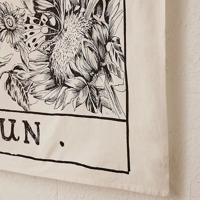 Astrologiczna tapiseria inspirowana tarotem, z motywem słońca i słoneczników. Możesz jej użyć jako narzuty na łóżko, dekoracji sufitu lub ściany. Idealna do wystroju pokoju w stylu witchcore lub boho.