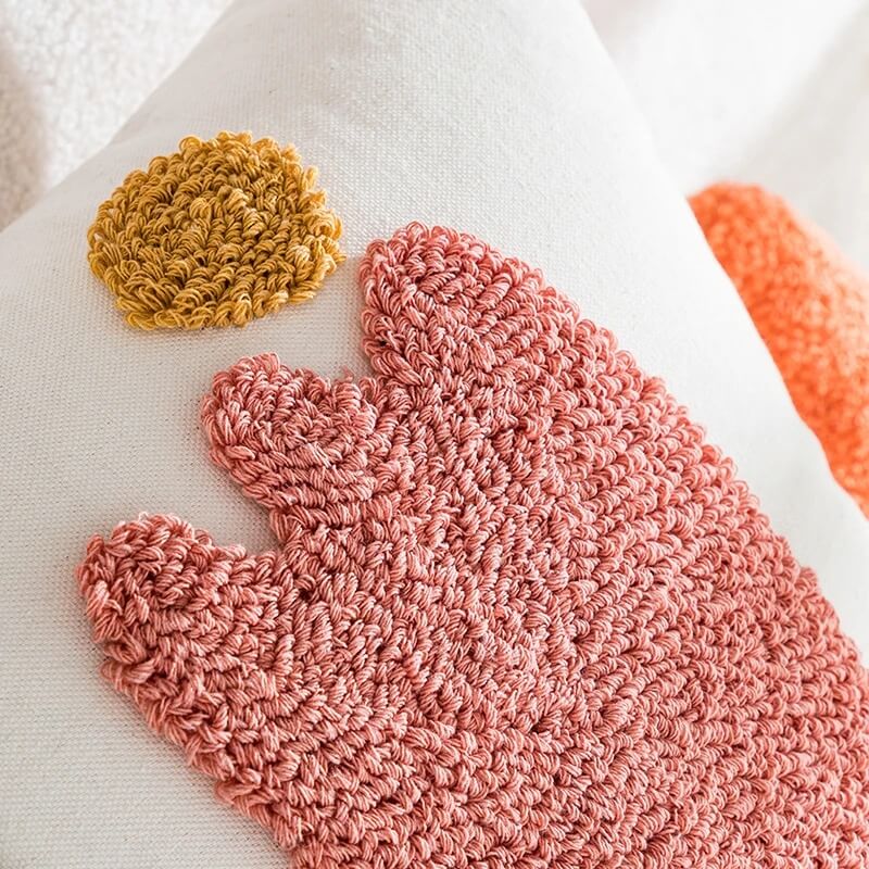 Kolekcja estetycznych poszewek na poduszki z pastelowymi tulipanami wykonanymi metodą tuftingu na całej wierzchniej stronie dekoracyjnej poszewki. Wykonane z gęstej, grubej bawełnianej tkaniny typu canvas. Idealne do wystroju wnętrz w stylu boho, duńskiego pastelu oraz wszelkich aranżacji inspirowanych kwiatami.